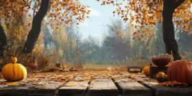A rustic wooden path lined with fallen leaves leads towards a picturesque scene of pumpkins, gourds, and a basket, creating a warm and inviting autumnal ambiance