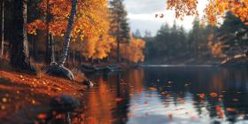 A rustic wooden path lined with fallen leaves leads towards a picturesque scene of pumpkins, gourds, and a basket, creating a warm and inviting autumnal ambiance