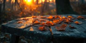 A weathered wooden table, adorned with a scattering of fallen leaves, sits bathed in the warm glow of the setting sun, evoking a sense of tranquility and the beauty of the changing seasons