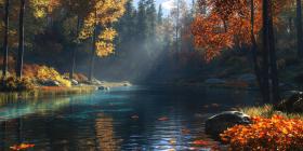 A rustic wooden path lined with fallen leaves leads towards a picturesque scene of pumpkins, gourds, and a basket, creating a warm and inviting autumnal ambiance