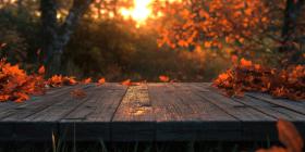 A weathered wooden table, adorned with a scattering of fallen leaves, sits bathed in the warm glow of the setting sun, evoking a sense of tranquility and the beauty of the changing seasons