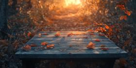 A weathered wooden table, adorned with a scattering of fallen leaves, sits bathed in the warm glow of the setting sun, evoking a sense of tranquility and the beauty of the changing seasons