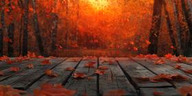 A weathered wooden table, adorned with a scattering of fallen leaves, sits bathed in the warm glow of the setting sun, evoking a sense of tranquility and the beauty of the changing seasons