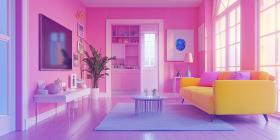 This vibrant living room, awash in shades of pink and yellow, offers a playful and cheerful atmosphere, inviting relaxation and imaginative play