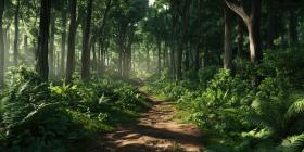 A 360-degree view of a sun-dappled forest path, inviting you to step into the tranquil scene and explore the lush surroundings