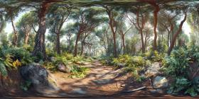 A 360-degree view of a sun-dappled forest path, inviting you to step into the tranquil scene and explore the lush surroundings