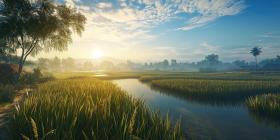 A picturesque scene of a rice paddy bathed in the golden light of sunrise, with a small village and lush greenery in the background