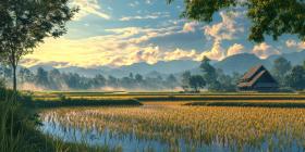 A picturesque scene of a rice paddy bathed in the golden light of sunrise, with a small village and lush greenery in the background