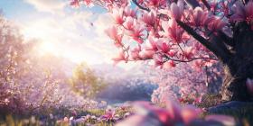 A majestic tree, adorned with a profusion of delicate white blossoms, stands sentinel over a vibrant meadow, where wildflowers bloom in a riot of color under a bright spring sky