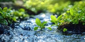 A crystal-clear stream, flanked by lush greenery, gently flows over smooth stones, creating a tranquil and inviting scene