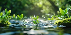 A crystal-clear stream, flanked by lush greenery, gently flows over smooth stones, creating a tranquil and inviting scene