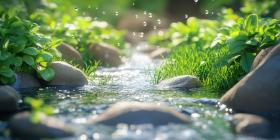 A crystal-clear stream, flanked by lush greenery, gently flows over smooth stones, creating a tranquil and inviting scene