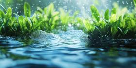 A crystal-clear stream, flanked by lush greenery, gently flows over smooth stones, creating a tranquil and inviting scene