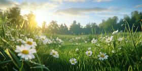 A vibrant field of daisies stretches towards a horizon bathed in the golden light of sunset, creating a scene of idyllic beauty and endless possibilities