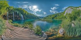 Immerse yourself in the breathtaking beauty of Plitvice Lakes National Park with this immersive 360 view. Crystal-clear turquoise waters cascade through lush forests