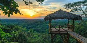 A wooden observation tower rises above a vast expanse of lush rainforest, offering a breathtaking vantage point to witness the majesty of the jungle at dawn