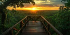 A wooden observation tower rises above a vast expanse of lush rainforest, offering a breathtaking vantage point to witness the majesty of the jungle at dawn
