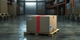 A sturdy cardboard box, secured with red tape and a barcode, rests on a wooden pallet, ready to embark on its journey through the global supply chain