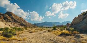 A sun-drenched landscape unfolds with rugged mountains framing a vast desert plain, where a dirt road winds its way towards a distant horizon, promising adventure and discovery