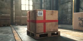 A sturdy cardboard box, secured with red tape and a barcode, rests on a wooden pallet, ready to embark on its journey through the global supply chain