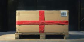 A sturdy cardboard box, secured with red tape and a barcode, rests on a wooden pallet, ready to embark on its journey through the global supply chain