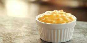 A bowl of smooth, golden cheese sauce, ready to be savored, evokes a sense of pure comfort and cheesy goodness