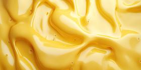 A close-up of a rich and creamy cheese, its surface glistening with a golden hue and dotted with tiny air bubbles, inviting you to savor its decadent texture and flavor