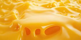 A close-up of a rich and creamy cheese, its surface glistening with a golden hue and dotted with tiny air bubbles, inviting you to savor its decadent texture and flavor