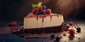 A slice of creamy cheesecake, adorned with a vibrant assortment of fresh raspberries and blueberries, sits atop a bed of glistening red sauce, creating a visual masterpiece of sweet indulgence