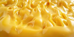 A close-up of a rich and creamy cheese, its surface glistening with a golden hue and dotted with tiny air bubbles, inviting you to savor its decadent texture and flavor