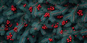 A vibrant arrangement of lush green foliage adorned with clusters of bright red berries, creating a festive and inviting winter scene