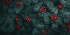 A vibrant arrangement of lush green foliage adorned with clusters of bright red berries, creating a festive and inviting winter scene