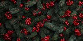 A vibrant arrangement of lush green foliage adorned with clusters of bright red berries, creating a festive and inviting winter scene