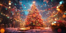 A close-up of a snow-dusted Christmas tree, illuminated by warm fairy lights, capturing the magic and wonder of the holiday season