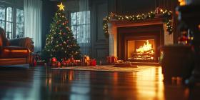 A beautifully decorated Christmas tree gleams with festive lights, casting a warm glow over a living room where a crackling fire burns in the hearth, creating a scene of holiday cheer and anticipation