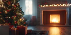 A beautifully decorated Christmas tree gleams with festive lights, casting a warm glow over a living room where a crackling fire burns in the hearth, creating a scene of holiday cheer and anticipation