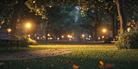 A lush green park stretches out amidst a towering cityscape, offering a tranquil escape from the hustle and bustle of city life