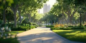 A lush green park stretches out amidst a towering cityscape, offering a tranquil escape from the hustle and bustle of city life