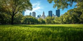 A lush green park stretches out amidst a towering cityscape, offering a tranquil escape from the hustle and bustle of city life