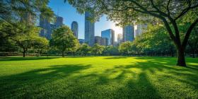 A lush green park stretches out amidst a towering cityscape, offering a tranquil escape from the hustle and bustle of city life
