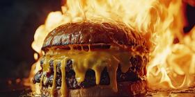 A mouthwatering cheeseburger, dripping with melted cheese, sizzles against a backdrop of fiery flames, promising a taste of pure indulgence