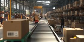 A Cardboard Odyssey: A Package Travels Along a Conveyor Belt in a Modern Warehouse