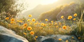 A Sun-Kissed Meadow: A Field of Delicate Yellow Flowers Basking in the Warm Glow of Sunset