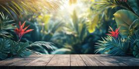 A Sun-Dappled Paradise: A Wooden Deck Overlooks a Lush Tropical Landscape, Framed by Vibrant Blooms and Lush Foliage
