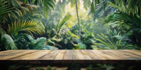 A Sun-Dappled Paradise: A Wooden Deck Overlooks a Lush Tropical Landscape, Framed by Vibrant Blooms and Lush Foliage