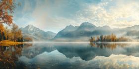 A Still Lake Reflects Majestic Mountains Cloaked in Mist, as Autumn Leaves Paint the Forested Shoreline in Golden Hues