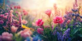A Vibrant Symphony of Blooms: A Field of Flowers Basking in the Warm Glow of Sunset