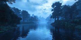 A Misty Enchantment: A River Winds Through a Verdant Valley, Mist Cloaking the Mountains in an Air of Mystery