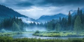 A Misty Enchantment: A River Winds Through a Verdant Valley, Mist Cloaking the Mountains in an Air of Mystery
