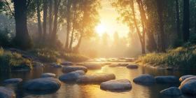 Serene Sunset on the Riverbank: A Tranquil Scene with Smooth Stones and a Golden Sky